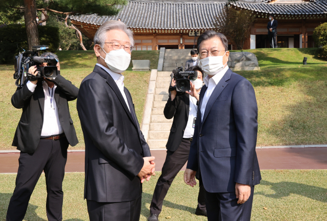 문 대통령은 26일 이재명 더불어민주당 대선 후보를 만난 자리에서도 대장동 의혹은 물론 부동산 문제 자체를 꺼내지 않았다. 청와대 상춘재에서 이 후보를 만난 문 대통령은 이 후보에게 “당내 경선에서 민주당 대선 후보로 선출되신 것을 축하드린다”며 “이낙연 전 민주당 대표와의 회동은 아주 좋았다”고 평가했다. 이어 전날 국회 시정연설을 거론하며 “내년도 예산은 다음 정부가 주로 사용할 예산이라는 점을 많이 감안하면서 편성했다”며 “대선 과정에서 좋은 정책을 많이 발굴해달라”고 당부했다. 이에 이 후보는 “나는 경기도지사로 문재인 정부의 일원”이라며 “문재인 정부가 성공하고 역사적인 정부로 남도록 최선을 다하도록 하겠다”고 화답했다.