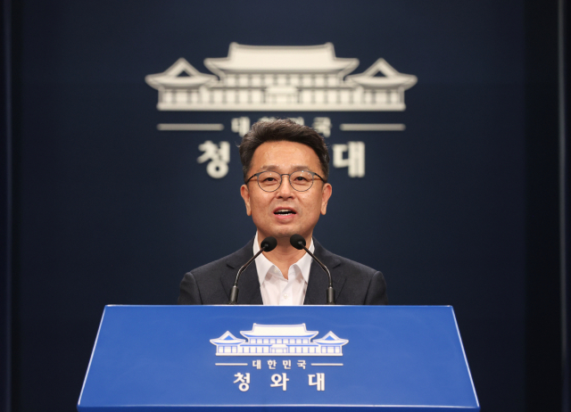 이철희 청와대 정무수석이 26일 청와대 춘추관 대브리핑룸에서 문재인 대통령과 이재명 더불어민주당 대선후보의 차담 결과와 관련해 브리핑하고 있다. /연합뉴스