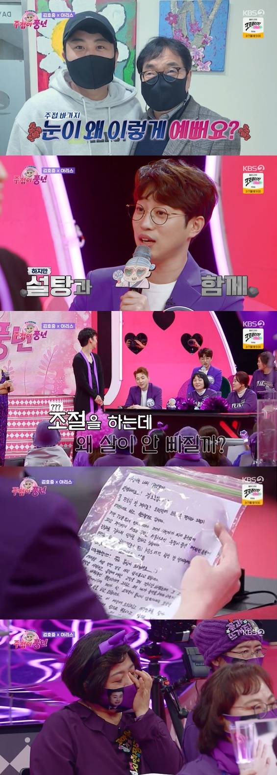 3일 방송된 KBS 2TV 예능 프로그램 ‘팬심자랑대회 주접이 풍년'(이하 ‘주접이 풍년’)에 가수 김호중의 공식 팬카페 ‘아리스’가 주접단으로 출연했다. 군 생활 중인 김호중을 대신해 그의 절친인 영기, 안성훈이 특별 게스트로 함께 했다.