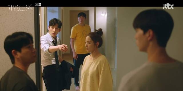 한기준은 술에 취해 진하경의 집을 찾아왔다. 그리곤 한기준은 집 안에서 남자(엄동한)의 목소리가 들리자 “누구야 대체”라며 막는 진하경을 밀어내고 그 주인공을 확인했다. 이어 때마침 12층에 엘리베이터가 서는 걸 확인한 신석호는 진태경이 맡긴 반찬통을 돌려주기 위해 찾아왔다가 이 사태를 목격했거 맥주를 사러 갔던 이시우도 돌아왔다. 생각지도 못한 5자 대면이었다. 진하경은 혼란스러운 상황 속, 한기준의 넥타이를 잡고 끌어내는 것을 택했다. (사진=JTBC ‘기상청 사람들 : 사내연애 잔혹사 편’ 캡처)
