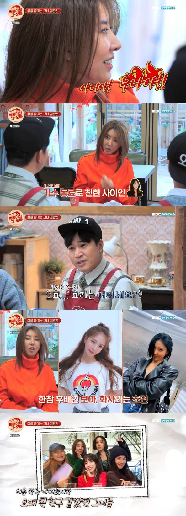 김완선은 “엄정화와 54살 동갑내기”라고 밝히며 “엄정화도 순둥순동하지 않지 않냐. 감성적이고 선한 사람”이라고 했다. 이에 김종민은 “잘 알죠”라며 공감을 표했다. 김완선은 이효리에 대해 “너무 선한 사람”이라며 “선함이 뚝뚝뚝 떨어진다”고 덧붙였다. 그는 “보아와 화사는 그 때 초면이었다”면서 “화사는 아기 같고 공손하다. 보아 씨도 너무 예쁘다”고 전했다.