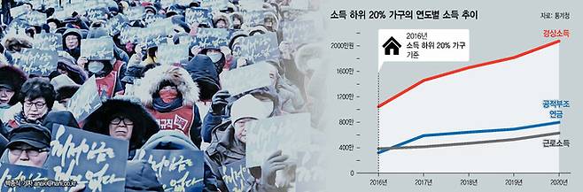 살펴본 결과는 통념을 뒤집었다. 문재인 정부 출범 직전인 2016년에 소득 하위 20%(1분위)였던 가구의 소득은 놀라울 정도로 높아졌다. 가구의 전체 소득이라고 할 수 있는 경상소득이나 복지수당 등의 공적부조만이 아니었다. 근로소득마저도 5년 동안 급격하게 올랐다. 이들 가구의 평균 경상소득은 연간 1000만원이었던 것이 두 배까지 늘어났다. 오히려 1분위 가구는 최저임금 인상 덕에 근로소득이 늘었고, 각종 복지급여와 국민연금 수령액이 커지면서 공적부조와 연금소득도 늘어났으며, 이들과 다른 소득을 합산한 경상소득이 급격하게 커진 것이다.