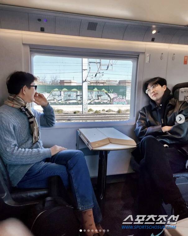 특히 아버지와 기차에 마주 보고 앉은 사진에서 아버지의 젊은 스타일이 눈길을 끈다. 긴 다리는 RM과 똑 닮은 ‘황금 비율’이었다.