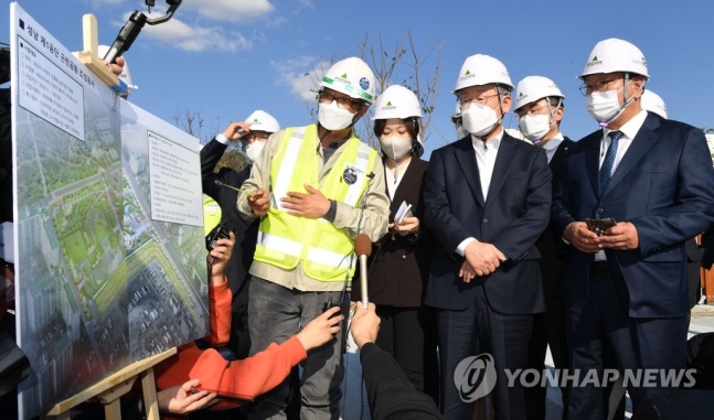(성남=연합뉴스) 더불어민주당 이재명 대선후보가 29일 경기도 성남 수정구 신흥동 성남 제1공단 근린공원 조성공사 현장을 찾아 관계자로부터 공사 현황에 대해 듣고 있다. 2021.10.29 [국회사진기자단] uwg806@yna.co.kr