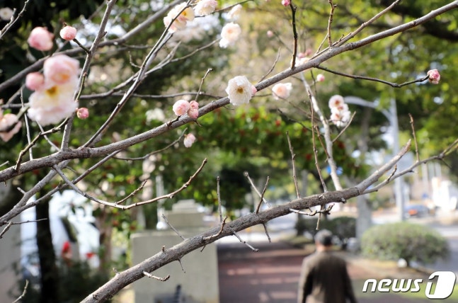 지난달 24일 오후 제주시 연동 거리에 매화가 활짝 펴 시선을 끌고 있다. 2022.1.24/뉴스1 © News1 오현지 기자